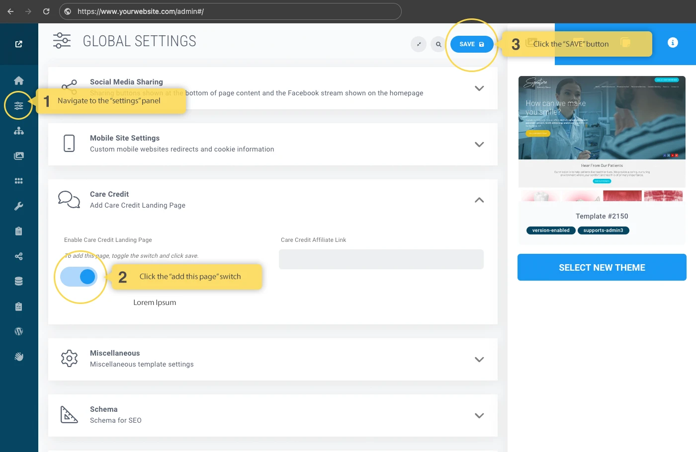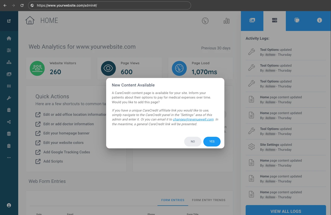 The majority of websites created with RevenueWell after April 2024 include the CareCredit landing page by default. If your website was created before April 2024, or if your site does not include the CareCredit landing page, follow the instructions in this below to activate it.